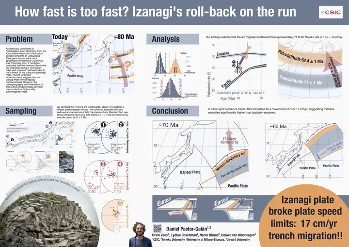 The PosterUnderstanding the tectonic evolution of oceanic plates is challenging due to their eventual subduction and loss. Marine magnetic anomalies on the Pacific Plate indicate that at least three plates once existed within the Panthalassa Ocean, all interacting with the Pacific Plate along spreading ridges. Global plate tectonic reconstructions suggest that Panthalassa initially featured a three-plate system with a central triple junction before the Early Jurassic inception of the Pacific Plate, eventually transitioning to a four-plate system. Accretionary complexes in northeastern Asia, stretching from the Kamchatka Peninsula to Hokkaido, contain remnants of Cretaceous-Paleogene intra-oceanic arcs, specifically the Nemuro-Olyutorsky and Kronotsky arcs. It has been proposed that the Nemuro-Olyutorsky arc originated along a mid-ocean ridge and migrated northward due to the rollback of the subducting Izanagi Plate. Recent kinematic reconstructions suggest that the Izanagi Plate moved rapidly northwestward. However, the paleogeography and kinematics of these arcs remain unclear, primarily due to a lack of high-quality paleomagnetic data. To clarify this, we sampled the Nemuro-Olyutorsky arc in Hokkaido, Japan, aiming to establish a reliable paleomagnetic record. The Nemuro Belt in eastern Hokkaido comprises forearc sedimentary sequences and juvenile intra-oceanic arc rocks from the Campanian to Paleocene. We collected samples from two sedimentary formations of late Campanian-Early Maastrichtian age, sufficient for elongation-inclination correction, along with pillow lavas and sills dated at 71 ± 1 Ma and other lavas and sills dated at 62 ± 1 Ma. Our findings indicate that the arc migrated northward from approximately 71 to 62 Ma at a rate of 19.4 ± 10 cm/yr (Fig. 1). In a hot-spot reference frame, this translates to a movement of over 15 cm/yr, suggesting rollback velocities significantly higher than typically assumed.